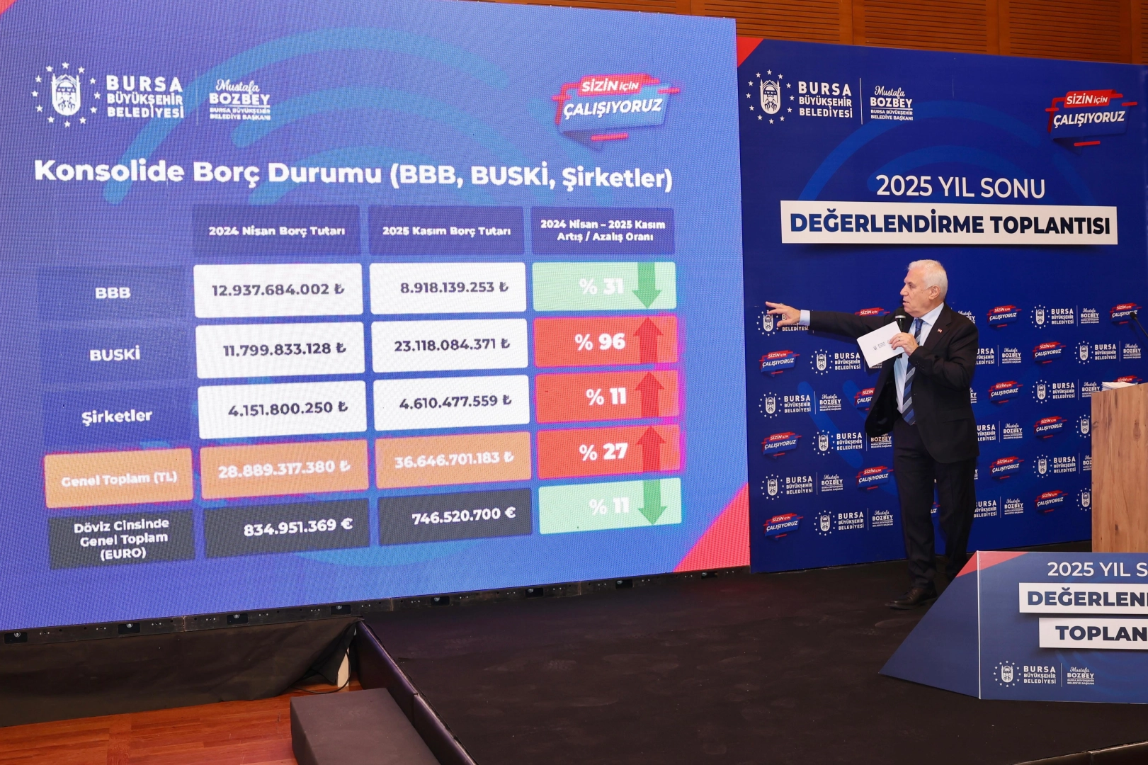 Bursa Büyükşehir Belediye Başkanı Mustafa Bozbey, kamuoyuyla paylaştığı konsolide borç tablosunda 2024 Nisan-2025 Kasım dönemine ait verileri açıkladı. Veriler, Bursa Büyükşehir Belediyesi'nin borç yükünde düşüşe işaret ederken, BUSKİ'de borcun neredeyse iki katına çıktığını ortaya koydu.