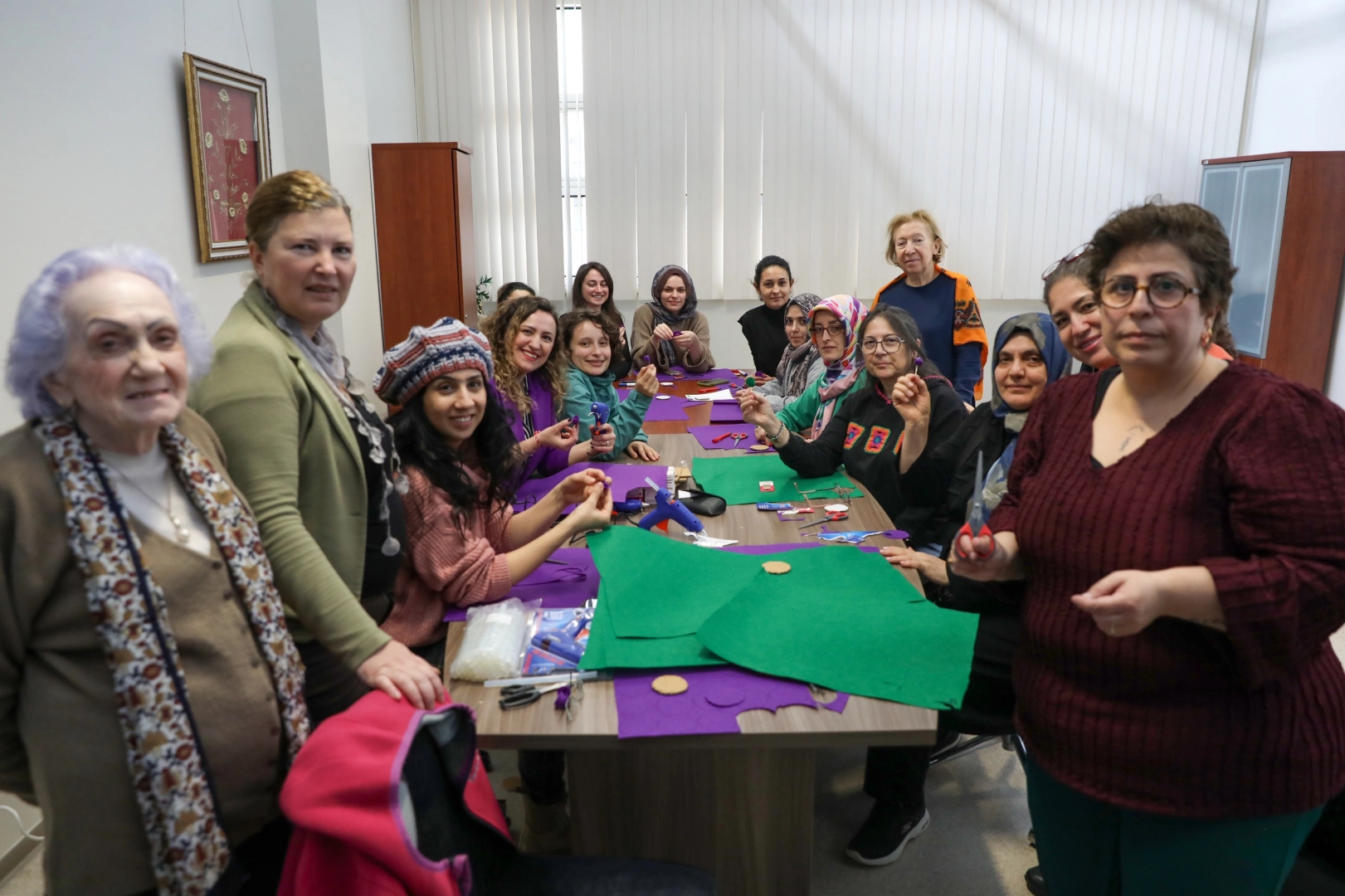 Bursa Kent Konseyi Kadın Meclisi’nde gerçekleştirilen atölye çalışmasında, keçe kumaşlar, renkli iplikler, düğmeler ve süsleme malzemeleri kullanılarak birbirinden renkli ürünler hazırlandı. Kadınların dayanışma ve ortak üretim gücünü bir kez daha ortaya koyan ürünler, 8 Mart Pazar günü yapılacak yürüyüşte kullanılacak.