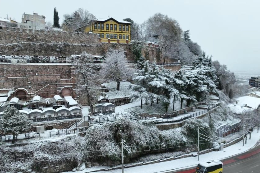 Bursa yeni yılın ilk gününe karla uyandı. Her yer bembeyaz olurken, şehrin simge noktaları dron ile görüntülendi.
