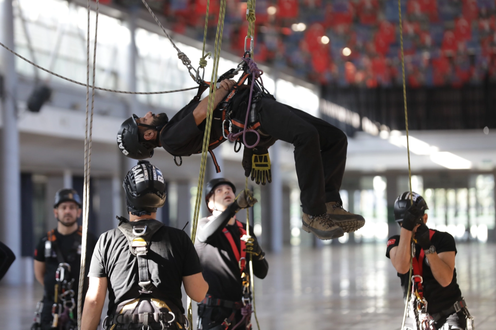 Bursa Büyükşehir Belediyesi, afetlere dirençli kent vizyonu doğrultusunda, BAM başta olmak üzere tüm ilgili birimlerin eğitim ve hazırlık faaliyetlerini aralıksız sürdürmeye devam ediyor. Merinos Yerleşkesi Fuaye Alanı’nda ‘İple Kurtarma Sistemleri ve Arama-Kurtarma eğitimi’ alan ekipler, uzman eğitmenler eşliğinde tavana asılı halatlara güvenlik ekipmanlarını kullanarak tırmandı.