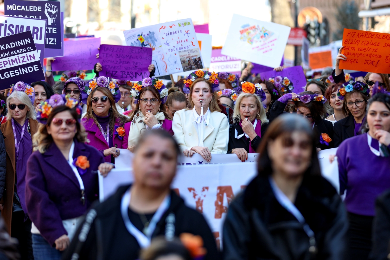 Cumhuriyet Caddesi’nden Hanlar Bölgesi’ne kadar yürüyen Bursalı kadınlar, 8 Mart Dünya Kadınlar Günü etkinlikleri kapsamında ‘Saklandığımız değil, Buluştuğumuz yerdeyiz. Biz birbirimizin çaresiyiz’ mesajını verdi. Ellerinde ‘İstismarı aklama! Asla yalnız yürümeyeceksin!’ yazılı döviz, afiş ve pankartlar taşıyan kadınlar, ‘Yaşasın kadın dayanışması’ sloganları atarak görünmez kılınmalarına, emeklerinin değersizleştirilmesine, şiddete ve ayrımcılığa karşı dayanışma mesajı verildi. Etkinliğe katılanlara rozet ve toka dağıtılırken, kadınlar saçlarına taktıkları çiçeklerle caddeyi adeta renk cümbüşüne çevirdi. Etkinliğe, Seden Bozbey, Bursa Kent Konseyi Genel Sekreteri Elvan Atay Özkan, Bursa Büyükşehir Belediyesi’nin kadın bürokratları, çeşitli sivil toplum kuruluşları temsilcileri, kadın muhtarlar ve çok sayıda kadın katıldı.
