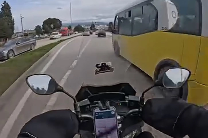 Olay, Bursa’nın Nilüfer ilçesine bağlı Üçevler Mahallesi Nilüfer Caddesi üzerinde meydana geldi. Kendi şeridinde ilerleyen motosiklet sürücüsünün önüne bir anda otobüs kırdı. Ani refleksle sol şeride geçerek kazadan son anda kurtulan motosikletli, otobüs şoförüne tepki gösterdi.