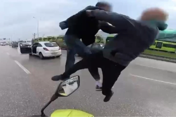 Bursa-İzmir yolu üzerinde ‘yol verme' meselesi nedeniyle iki sürücü arasında tartışma çıktı. Araçlarından inen taraflar birbirlerine uçan tekmeyle saldırdı. Korku dolu anlar kameraya yansırken, tarafları yoldan geçen kurye ve çevredeki sürücüler ayırdı. Görüntüler üzerine harekete geçen Bursa İl Emniyet Müdürlüğü ekipleri, kavga eden sürücülerin kimliklerini tespit etmek için çalışma başlattı.