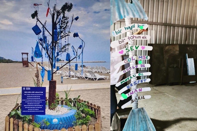 Sahillerdeki temizlik etkinliklerinde elde edilen kapaklarla ‘mavi bayrak’ temalı pano oluşturulurken, plastik şişelerden gemi maketi yapılarak çevre kirliliğine dikkat çekildi. Çevreye gelişigüzel atılan ve denizlerden çıkartılan lastikler ise ekipler tarafından atölyede temizlenip boyandıktan sonra balık figürü olarak tasarlanıp duvarları süsledi.