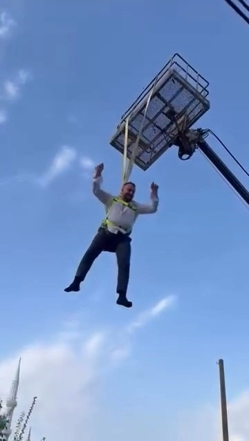 Vinç ile havaya kaldırdıkları damadın altında arkadaşları göbek attı.