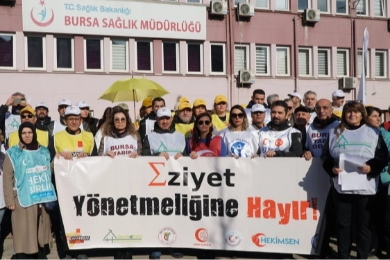 BURSA (İGFA) - Bursa Tabip Odası (BTO), Genel Sağlık İş Sendikası Bursa Şubesi, HEKİM SEN Bursa Şubesi, Hekimler Birliği Sendikası Bursa Şubesi, Sağlık ve Sosyal Hizmetler Emekçileri Sendikası Bursa Şubesi (SES), Bursa Aile Hekimleri Derneği (BURSAHED) ile Birlik ve Dayanışma Sendikası’nın çağrısıyla Bursa İl Sağlık Müdürlüğü önünde bir araya gelen sağlık çalışanları basın açıklaması gerçekleştirdi.