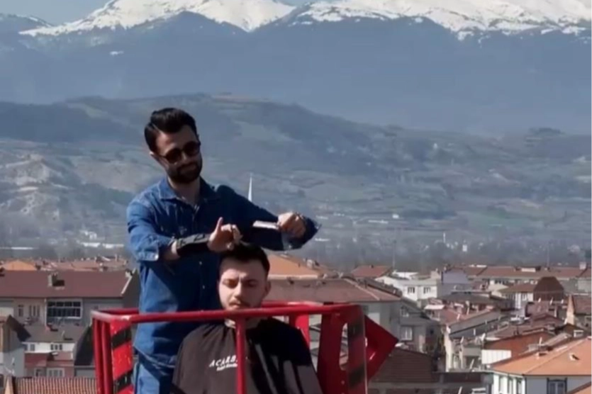 Bursa'da bir berber, müşterilerinin ilgisini çekebilmek için tuttuğu vincin kulesini kuaför salonuna çevirdi. Müşterilerini metrelerce yüksekte tıraş eden berberin o anları dronla görüntülenirken, görüntüler sosyal medyada viral oldu.