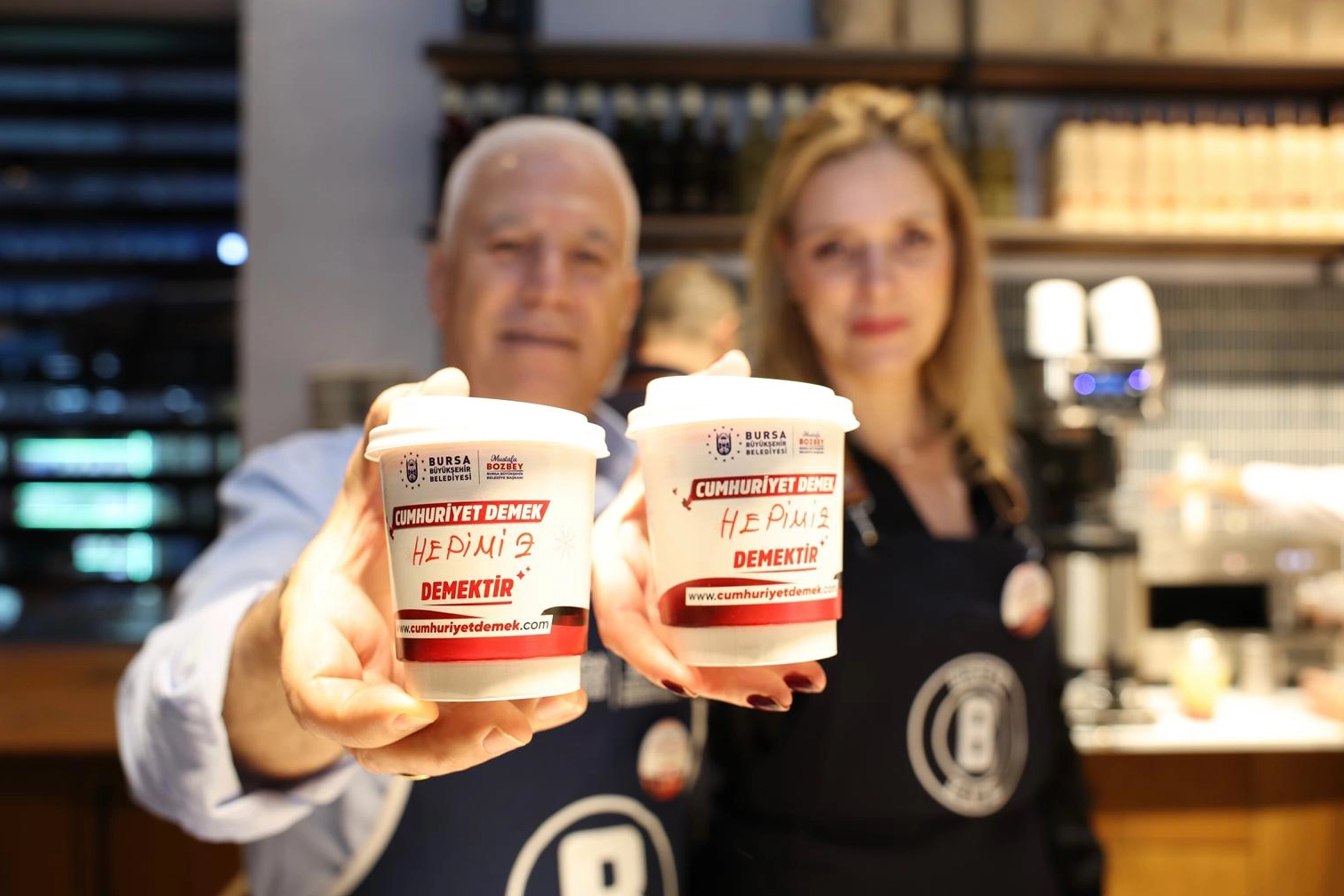Eşi Seden Bozbey ile birlikte barista önlüklerini giyen Başkan Bozbey, Cumhuriyetin 102. yılına özel olarak hazırlanan ‘Cumhuriyet Demek’ temalı bardaklarda içecek ikramında bulundu. Vatandaşların isimlerini ‘Cumhuriyet demek' temalı bardaklara yazan Başkan Mustafa Bozbey ve eşi Seden Bozbey, Atatürk’ün emanet ettiği Cumhuriyet’in sıcaklığını Bursalılarla birlikte paylaştı. Bu sene kutlamaların teması olan ‘Cumhuriyet demek, hepimiz demek’ sloganını da yazarak ikramda bulunan Başkan Bozbey ve eşi Seden Bozbey, kahve keyfini vatandaşlarla birlikte yaşadı.
