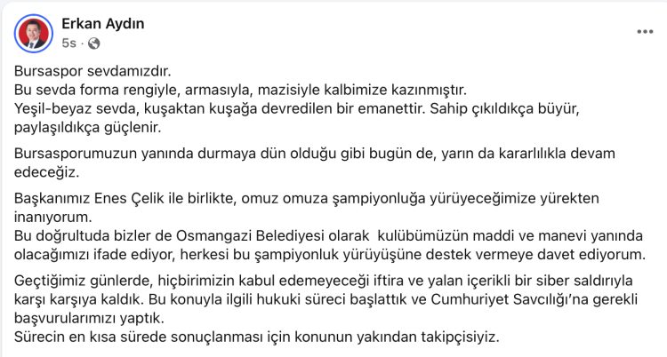 Bursaspor'un efsanevi bir sevda olduğunu vurgulayan Osmangazi Belediye Başkanı Erkan Aydın, şimdiye kadar hep Bursaspor'un yanında olduğunu, bundan sonrada olmaya devam edeceğini açıkladı. Ayrıca, Bursaspor hakkında iftira içerikli siber saldırılara karşı hukuki süreç başlatıldığını belirtti.
