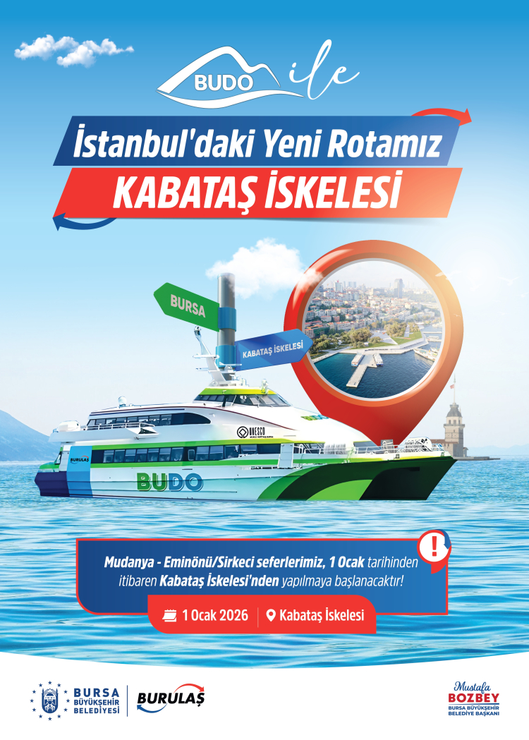 Bursa Büyükşehir Belediyesi iştiraklerinden BURULAŞ tarafından işletilen Bursa Deniz Otobüsleri (BUDO) İstanbul seferlerinin varış noktası, 1 Ocak 2026 tarihinden itibaren Kabataş Transfer Merkezi olacak.