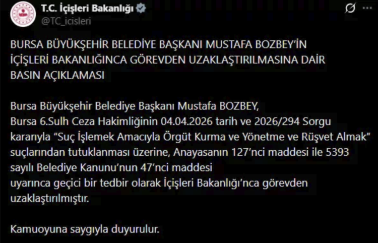 "Bursa Büyükşehir Belediye Başkanı Mustafa BOZBEY, Bursa 6.Sulh Ceza Hakimliğinin 04.04.2026 tarih ve 2026/294 Sorgu kararıyla “Suç İşlemek Amacıyla Örgüt Kurma ve Yönetme ve Rüşvet Almak” suçlarından tutuklanması üzerine, Anayasanın 127’nci maddesi ile 5393 sayılı Belediye Kanunu’nun 47’nci maddesi uyarınca geçici bir tedbir olarak İçişleri Bakanlığı’nca görevden uzaklaştırılmıştır"