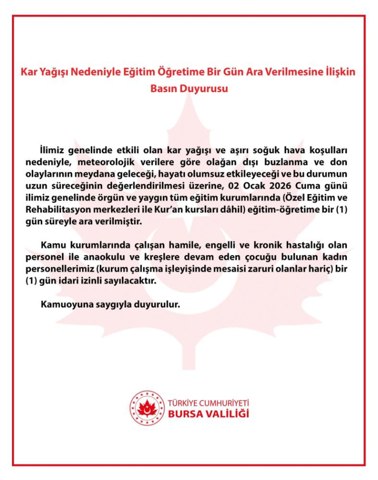 Bursa Valiliğinden yapılan açıklamada, "İlimiz genelinde etkili olan kar yağışı ve aşırı soğuk hava şartları sebebiyle, meteorolojik verilere göre olağan dışı buzlanma ve don olaylarının meydana geleceği, hayatı olumsuz etkileyeceği ve bu durumun uzun süreceğinin değerlendirilmesi üzerine, 2 Ocak 2026 Cuma günü ilimiz genelinde örgün ve yaygın tüm eğitim kurumlarında (Özel Eğitim ve Rehabilitasyon merkezleri ile Kur’an kursları dahil) eğitim-öğretime 1 gün süreyle ara verilmiştir. Kamu kurumlarında çalışan hamile, engelli ve kronik hastalığı olan personel ile anaokulu ve kreşlere devam eden çocuğu bulunan kadın personellerimiz (kurum çalışma işleyişinde mesaisi zaruri olanlar hariç) 1 gün idari izinli sayılacaktır" denildi.