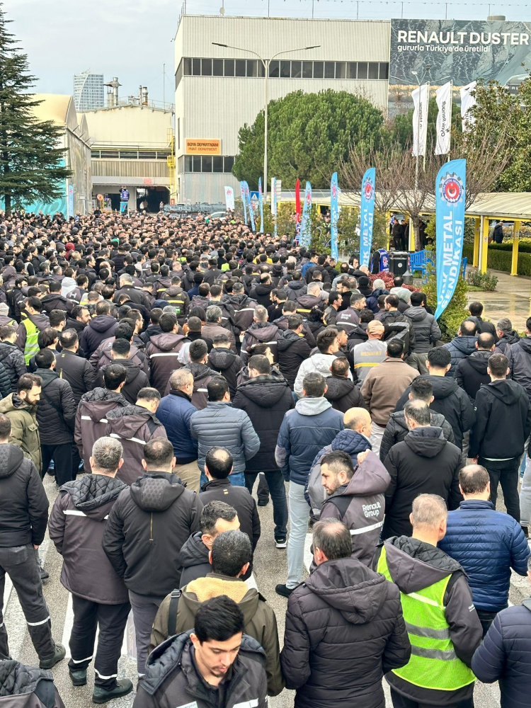 Türk Metal Sendikası’nın MESS’in uzlaşmaz tavrına karşı başlattığı eylem süreci vites yükseltti. Bursa’daki OYAK Renault fabrikasında 8/16 ve 16/24 vardiyaları birleşerek dev bir gövde gösterisine imza attı. Vardiya değişim saati geldiğinde işçiler tezgâh başından ayrıldı ve imalat tam 35 dakika boyunca tamamen durduruldu.