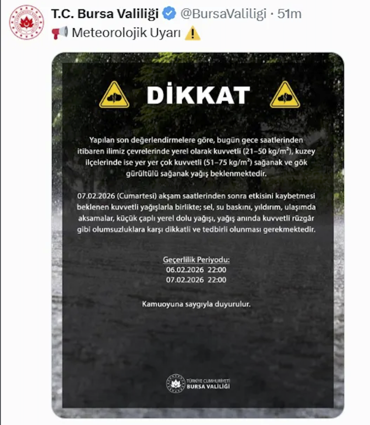 07.02.2026 (Cumartesi) akşam saatlerinden sonra etkisini kaybetmesi beklenen kuvvetli yağışlarla birlikte; sel, su baskını, yıldırım ulaşımda aksamalar, küçük çaplı yerel dolu yağışı, yağış anında kuvvetli rüzgâr gibi olumsuzluklara karşı dikkatli ve tedbirli olunması gerekmektedir.