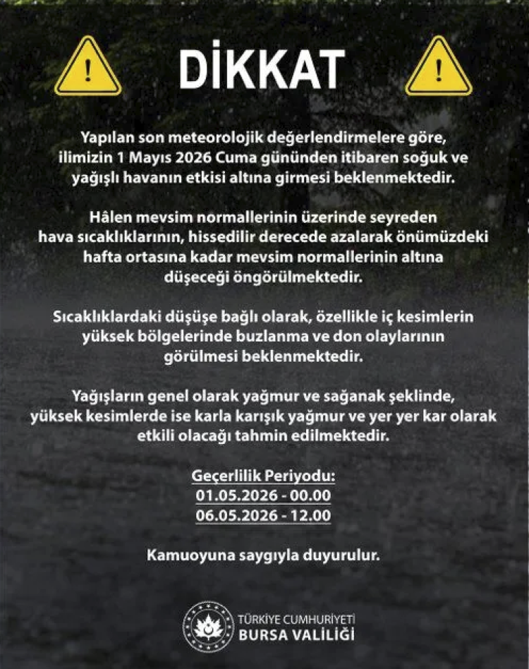Bursa Valiliği tarafından yapılan açıklamada, 1 Mayıs 2026 Cuma gününden itibaren kent genelinde hava sıcaklıklarının düşeceği ve soğuk ile yağışlı havanın etkili olacağı bildirildi.