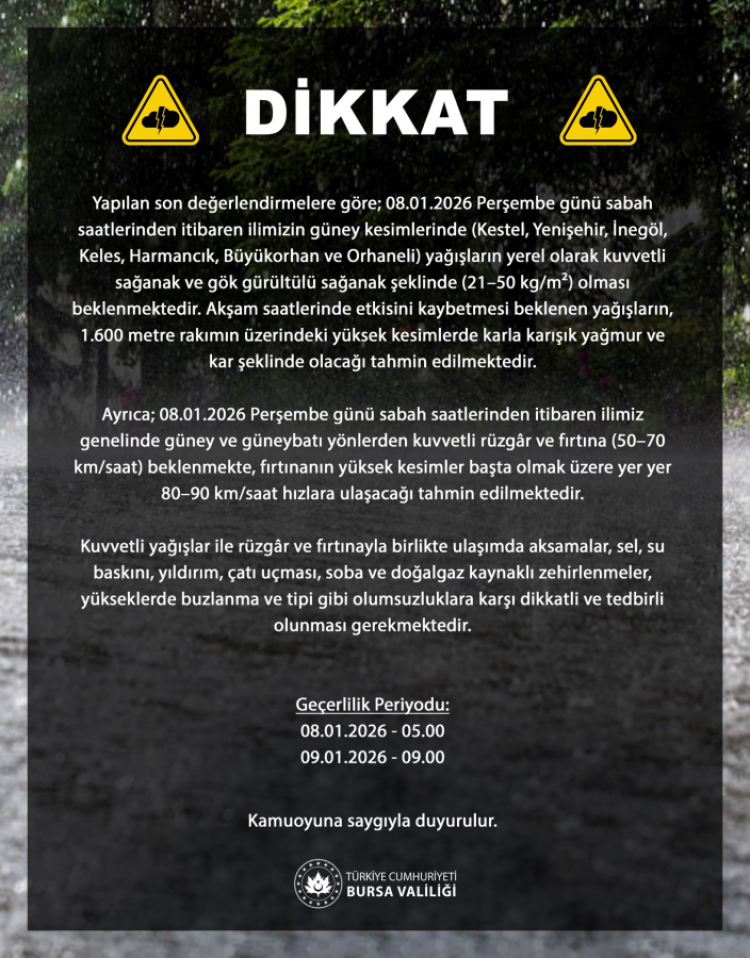 Yapılan son değerlendirmelere göre; 08.01.2026 Perşembe günü sabah saatlerinden itibaren ilimizin güney kesimlerinde (Kestel, Yenişehir, İnegöl, Keles, Harmancık, Büyükorhan ve Orhaneli) yağışların yerel olarak kuvvetli sağanak ve gök gürültülü sağanak şeklinde (21-50 kg/m²) olması beklenmektedir. Akşam saatlerinde etkisini kaybetmesi beklenen yağışların, 1.600 metre rakımın üzerindeki yüksek kesimlerde karla karışık yağmur ve kar şeklinde olacağı tahmin edilmektedir.