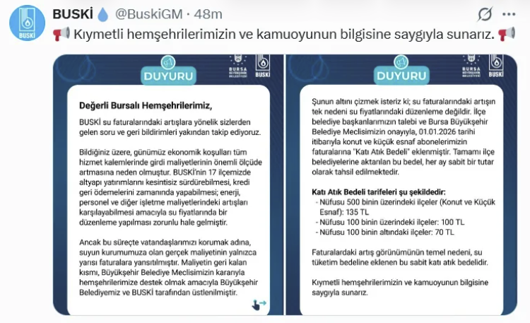 Bursa Büyükşehir Belediyesi, BUSKİ su faturalarındaki artışlarla ilgili sosyal medya hesabından açıklama yaptı. Yapılan paylaşımda, vatandaşlardan gelen soru ve geri bildirimlerin yakından takip edildiği belirtilirken, günümüz ekonomik koşullarının tüm hizmet kalemlerinde maliyetleri artırdığı vurgulandı.