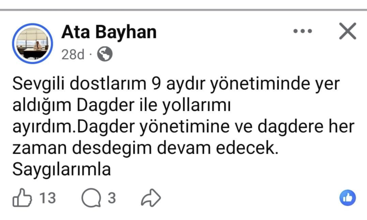 İstifa kararını kişisel sosyal medya hesapları üzerinden yaptığı bir açıklama ile paylaşan Bayhan, Paylaşımında, "Sevgili dostlarım, 9 aydır yönetiminde yer aldığım DAĞDER ile yollarımı ayırdım" ifadelerini kullanan Bayhan, görev süresi boyunca yürüttüğü çalışmaların ardından yönetim kurulu üyeliğini sonlandırdığını belirtti.
