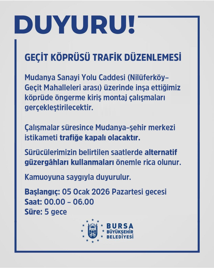 Montaj çalışmalarına 05 Ocak 2026 Pazartesi gecesi başlanacak olup, çalışmaların 5 gece sürmesi planlanmaktadır. Çalışmalar süresince, 00.00 – 06.00 saatleri arasında Mudanya–şehir merkezi istikametindeki yol trafiğe kapatılacaktır.