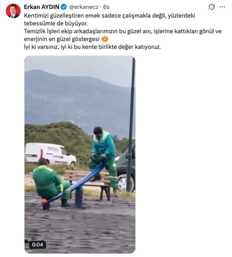Erkan Aydın da görüntüleri sosyal medya hesabından paylaşarak temizlik personeline teşekkür etti. Aydın, paylaşımında çalışanların özverili çalışmalarına dikkat çekti.