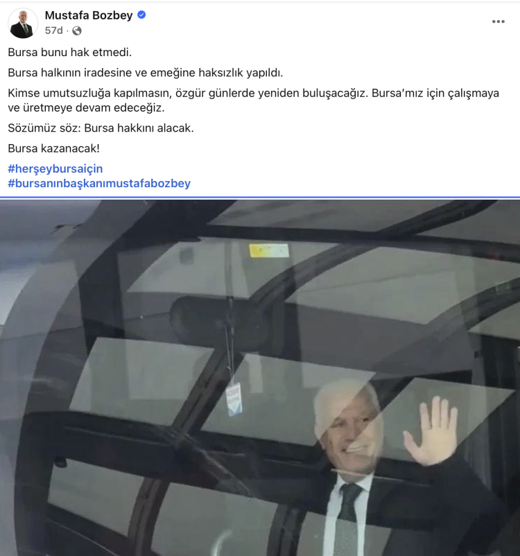 "Kimse umutsuzluğa kapılmasın, özgür günlerde yeniden buluşacağız. Bursa’mız için çalışmaya ve üretmeye devam edeceğiz" ifadeleri kullanıldı. Mesajda ayrıca, "Sözümüz söz: Bursa hakkını alacak. Bursa kazanacak" cümleleri yer aldı. Paylaşım, Mustafa Bozbey'in adıyla kullanılan sosyal medya hesapları üzerinden kamuoyuna duyuruldu.
