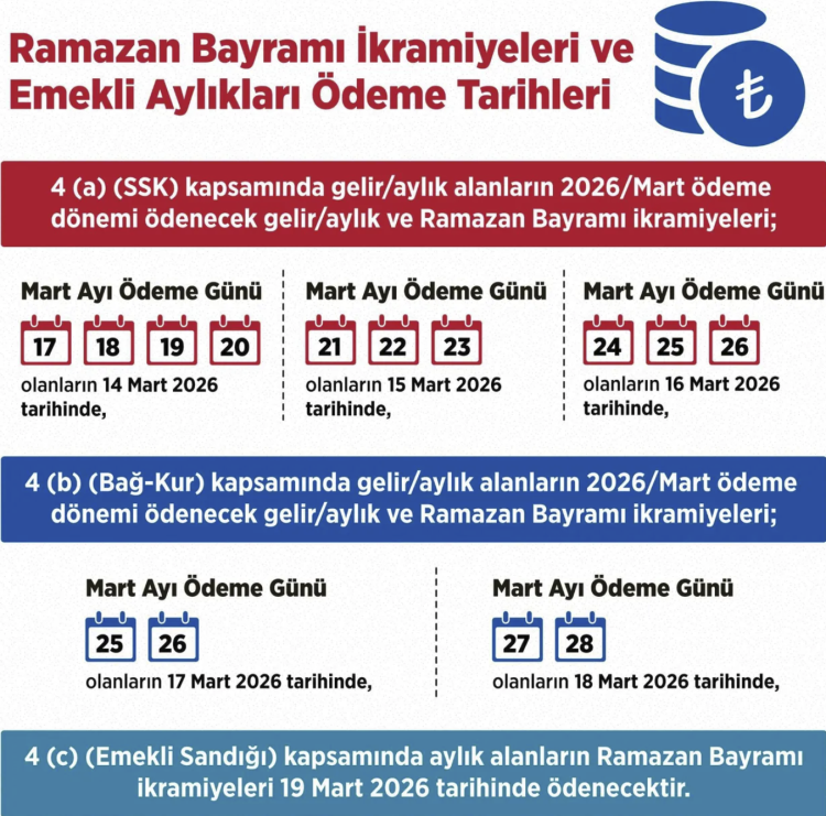 Emekli Sandığı bünyesinde aylık alanların Ramazan Bayramı ikramiyeleri ise tek seferde 19 Mart 2026 tarihinde banka hesaplarına yatırılacak.