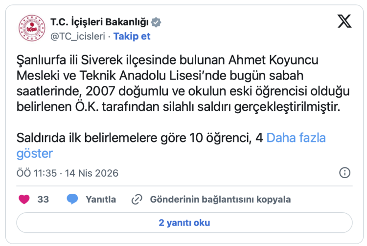 Şanlıurfa ili Siverek ilçesinde bulunan Ahmet Koyuncu Mesleki ve Teknik Anadolu Lisesi’nde bugün sabah saatlerinde, 2007 doğumlu ve okulun eski öğrencisi olduğu belirlenen Ö.K. tarafından silahlı saldırı gerçekleştirildi.