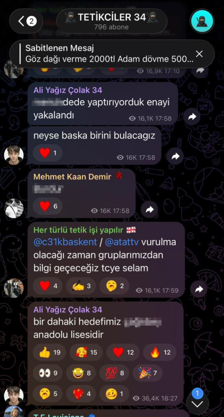 Kahramanmaraş ve Şanlıurfa’da peş peşe yaşanan okul saldırıları Türkiye’yi yasa boğdu. Saldırıların ardından Telegram gruplarında paylaşılan mesajlar adeta kan dondurdu. Daha önce Ahmet Minguzzi ve İkbal Uzuner cinayetleriyle Türkiye’nin gündemine gelen "C31 K" isimli Telegram grubunda okul saldırıların ardından akıllara durgunluk veren paylaşımlar yapıldı. Yaklaşık 100 bin üyesi olan grupta saldırganların övüldüğü, yeni saldırılar için tarih ve konum verildiği görüldü.