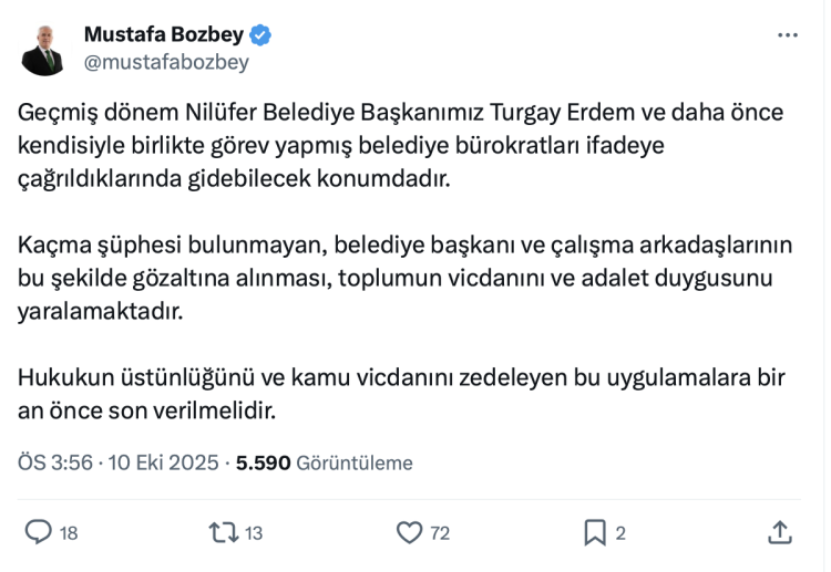 Erdem'in kaçma şüphesi olmadığını belirterek gözaltına alınmasının adaletsizlik olduğunu belirten Başkan Bozbey, X hesabından yaptığı açıklamada, "Geçmiş dönem Nilüfer Belediye Başkanımız Turgay Erdemve daha önce kendisiyle birlikte görev yapmış belediye bürokratları ifadeye çağrıldıklarında gidebilecek konumdadır. Kaçma şüphesi bulunmayan, belediye başkanı ve çalışma arkadaşlarının bu şekilde gözaltına alınması, toplumun vicdanını ve adalet duygusunu yaralamaktadır. Hukukun üstünlüğünü ve kamu vicdanını zedeleyen bu uygulamalara bir an önce son verilmelidir." ifadelerine yer verdi.