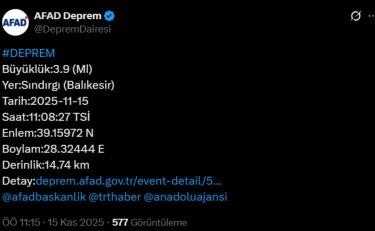 Afet ve Acil Durum Yönetimi Başkanlığı (AFAD) Balıkesir’in Sındırgı ilçesinde 4.1 büyüklüğünde deprem meydana geldiğini açıkladı.
