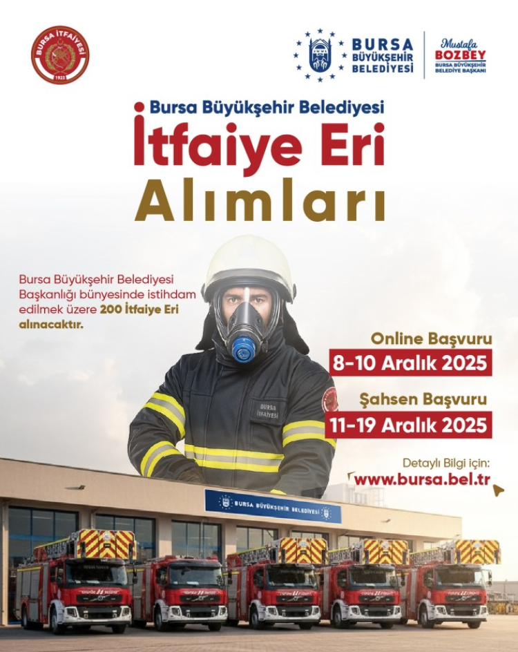 Bursa Büyükşehir Belediyesi, 657 sayılı Devlet Memurları Kanunu kapsamında çalıştırılmak üzere 200 itfaiye eri alımı yapacağını duyurdu.