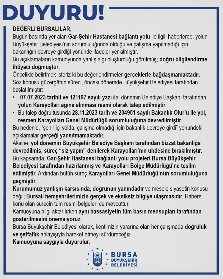 Bursa Büyükşehir Belediyesinden "Kamuoyuna Duyuru" başlığı ile yapılan resmi açıklama şu şekilde "Bugün basında yer alan Gar – Şehir Hastanesi bağlantı yolu ile ilgili haberlerde, yolun Büyükşehir Belediyesi’nin sorumluluğunda olduğu ve çalışma yapılmadığı için bakanlığın devreye girdiği önündeki ifadeleri yer almıştır.