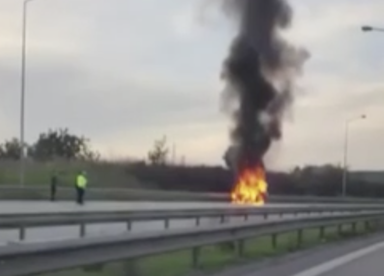 Bursa’da ehliyetsiz motosiklet kuryesi başka bir motosikletle çarpışması sonucu akaryakıt istasyonuna sürüklendi. Çarpışmanın şiddetiyle alev alan motosikleti, istasyon personeli söndürdü.