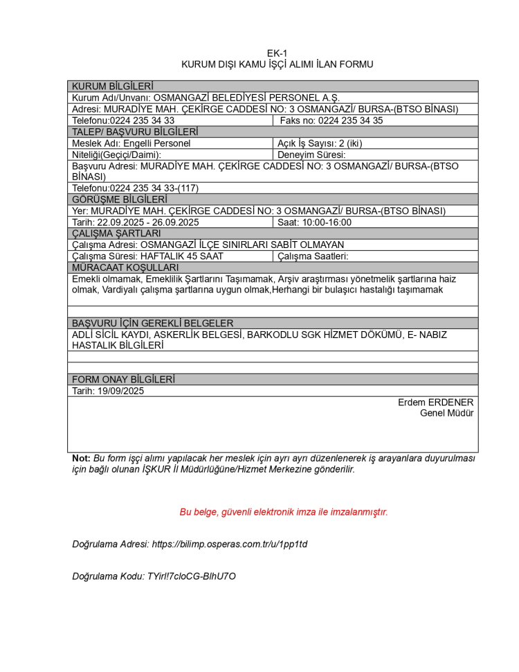 Belediye bünyesindeki Osmangazi Belediyesi Personel A.Ş., 2 engelli personel alımı yapacağını duyurdu.