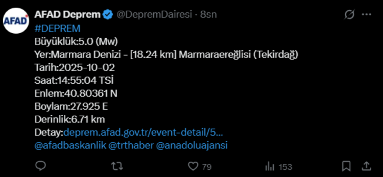 AFAD'dan yapılan açıklamaya göre, Marmaraereğlisi açıklarında 5 büyüklüğünde deprem oldu.