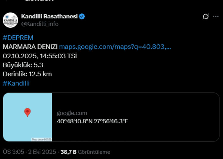 Marmara Denizi'nde 5 büyüklüğünde deprem meydana geldi.
