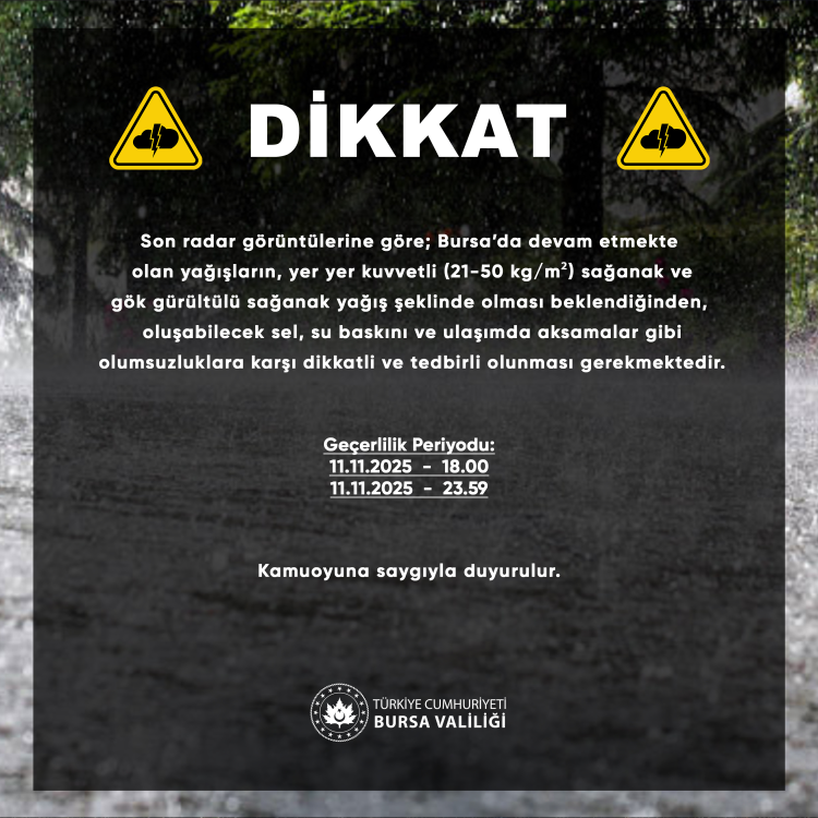 Bursa Valiliği vatandaşları kuvvetli sağanak yağış sonucu oluşabilecek olumsuzluklara karşı uyardı.