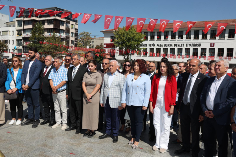 CHP Bursa İl Başkanı Nihat Yeşiltaş'ın, 81 il başkanıyla birlikte İstanbul’da yapılan açıklamaya katılması nedeniyle yer almadığı tören çelenk sunma töreni, saygı duruşu ve İstiklal Marşı'nın okunmasıyla başladı.