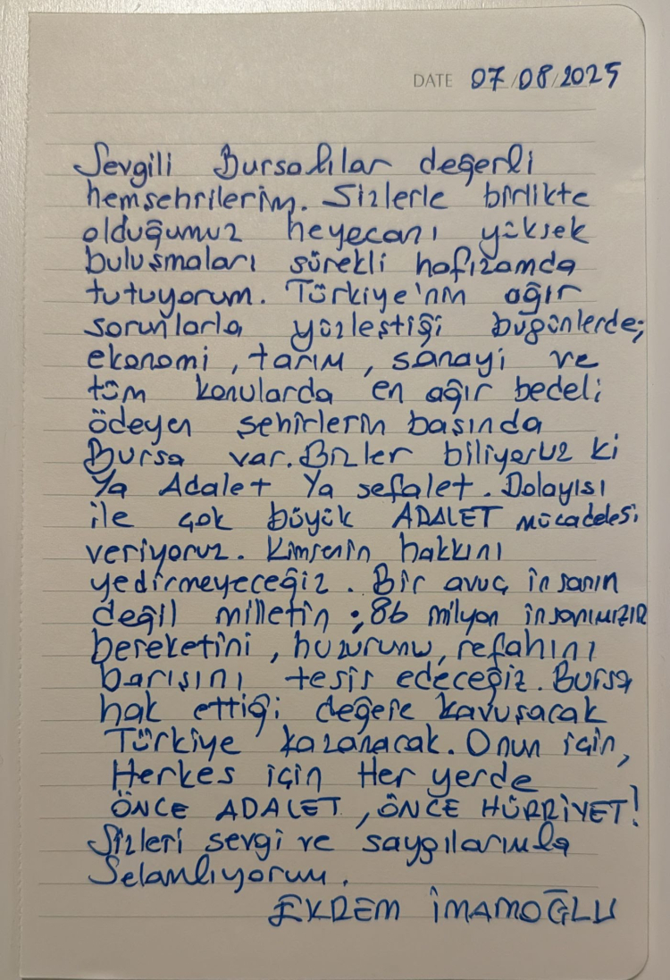 Ziyarette İmamoğlu’nun Bursalı yurttaşlara hitaben kaleme aldığı mektubunda, şu ifadeler yer aldı: