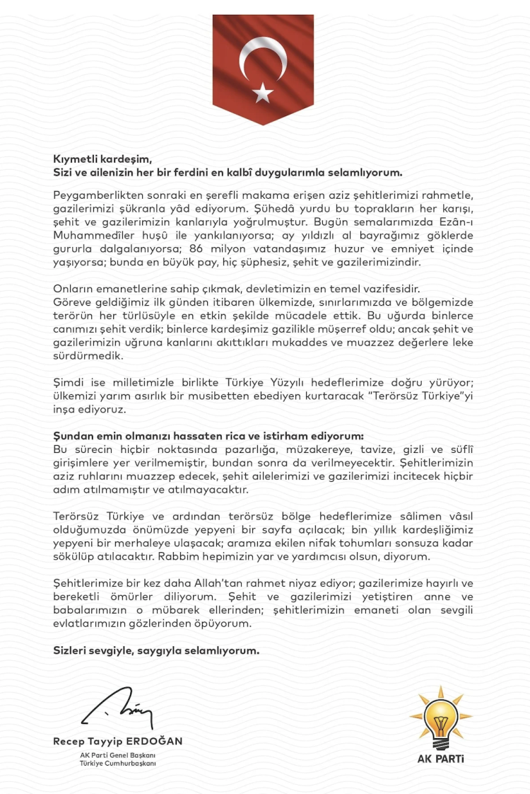 Son olarak Cumhurbaşkanı Erdoğan şehit ailelerine mektup yazdı.