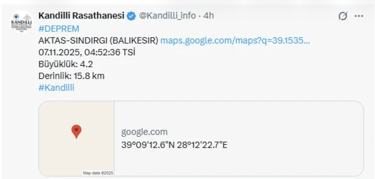 Son zamanlarda sık sık depremlerle gündeme gelen Balıkesir'in Sındırgı ilçesinde sarsıntılar devam ediyor. Kandilli Rasathanesi'nin sosyal medya hesabından yapılan son bilgilendirmeye göre, saat 04.52'de merkez üssü Sındırgı olan 4,2 büyüklüğünde bir deprem gerçekleşti.