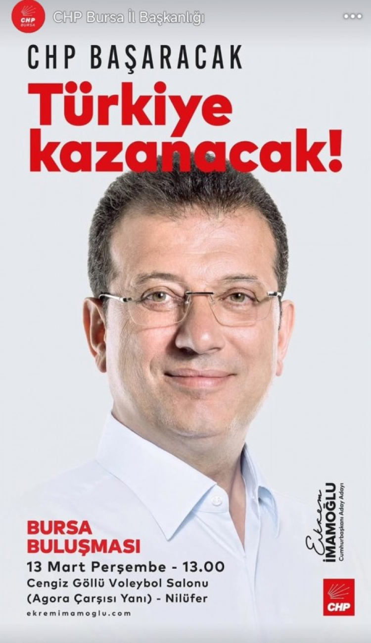İmamoğlu bugün saat 13:00 sıralarında Nilüfer Cengiz Göllü Voleybol Salonu'na gelecek ve 15:30 da Bursa'dan ayrılacak.