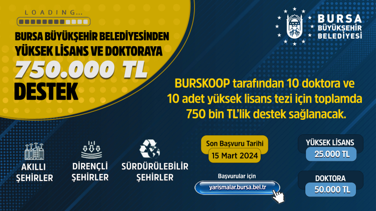 Bursa Büyükşehir Belediyesi tarafından ‘Akıllı şehirler, dirençli şehirler ve sürdürülebilir şehirler’ temasıyla bilimsel çalışmalara destek olmak amacıyla ‘Lisansüstü Tez Destek Programı’ düzenlendi. Yüksek lisans ve doktora düzeyindeki çalışmaları desteklemek amacıyla toplam 750.000 TL’lik kaynağın ayrıldığı programa, Bursa’da eğitim gören veya şehre katkı sağlayacak projeler üreten birçok öğrenci başvuruda bulundu. Destek programıyla, doğal kaynakları koruyan, sürdürülebilir ve yenilikçi çözümler geliştiren projeler üretilmesi, bilimsel çalışmalarla Bursa’nın geleceğine yön verilmesi hedeflendi. Tez çalışmalarını Bursa ölçeğinde gerçekleştiren yüksek lisans ve doktora öğrencileri, kentin sorunlarına yönelik bilimsel, yenilikçi ve uygulanabilir çözümler getirmek için çalışmalar yürüttü.