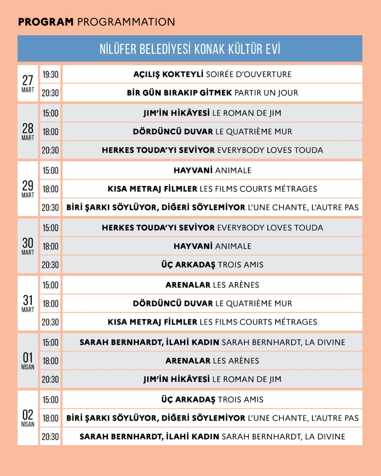 Nilüfer Belediyesi Konak Kültürevi’nin ev sahipliği yapacağı festival, 27 Mart günü açılış kokteyli ile başlayacak. Açılış filmi, aynı zamanda geçen yıl Cannes Film Festivali'nin açılış filmi olan “Bir Gün Bırakıp Gitmek” olacak. Gösterim kokteyl sonrası gerçekleşecek.