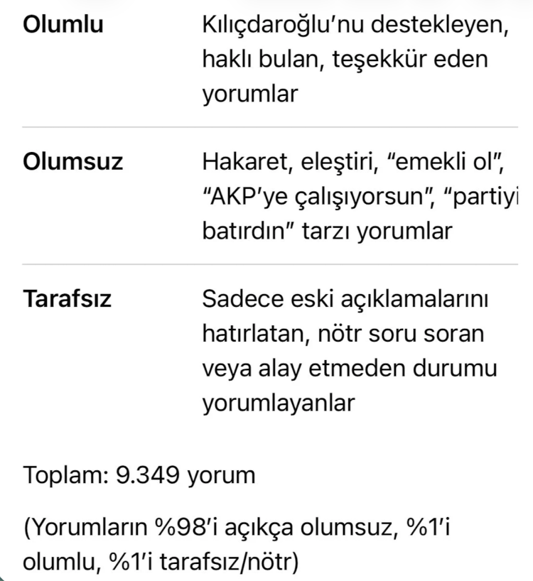 CHP eski Genel Başkanı Kemal Kılıçdaroğlu sosyal medya hesabından CHP'nin İmralı kararını eleştirirken, İBB soruşturmasına ilişkin de, "CHP arınmalıdır" paylaşımında bulundu. Kılıçdaroğlu'nun paylaşımına kısa sürede binlerce yorum gelirken yapay zeka Grok, yorumların yüzde 98'inin olumsuz olduğunu tespit etti.