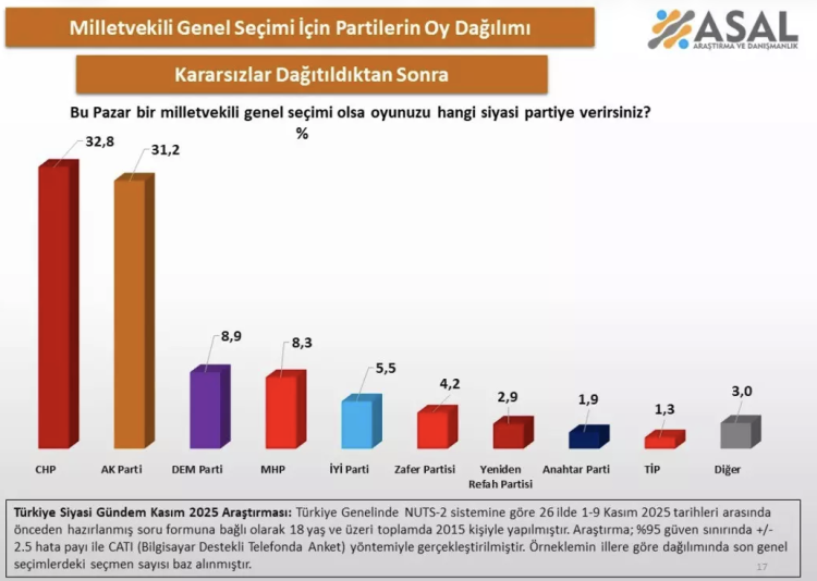 ASAL Araştırma’nın Kasım 2025 tarihli Türkiye Siyasi Gündem Araştırmasına göre, bu Pazar bir milletvekili genel seçimi yapılsa CHP yüzde 32,8 oy oranıyla birinci parti konumunda yer alırken AK Parti ise yüzde 31,2 ile CHP’nin hemen arkasından ikinci sırada yer aldı. Araştırmaya göre iki büyük parti arasındaki fark 1,6 puan olarak ölçüldü.
