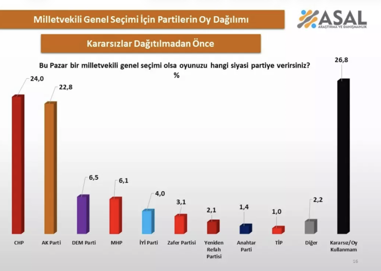 Kararsız seçmenler dağıtılmadan ortaya çıkan tabloya göre ise; CHP yüzde 24,0, AK Parti yüzde 22,8, DEM Parti yüzde 6,5 ve MHP yüzde 6,1 oy oranına sahip. İYİ Parti yüzde 4,0, Zafer Partisi yüzde 3,1, Yeniden Refah Partisi yüzde 2,1, Anahtar Parti yüzde 1,4, TİP yüzde 1,0 olarak ölçülürken, diğer partilerin toplamı yüzde 2,2 düzeyinde kaldı.