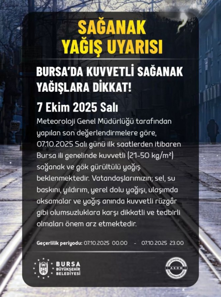 Bursa Büyükşehir Belediyesi, kent genelinde 7 Ekim Salı günü etkili olacak gök gürültülü sağanak yağışlara karşı vatandaşları uyardı.